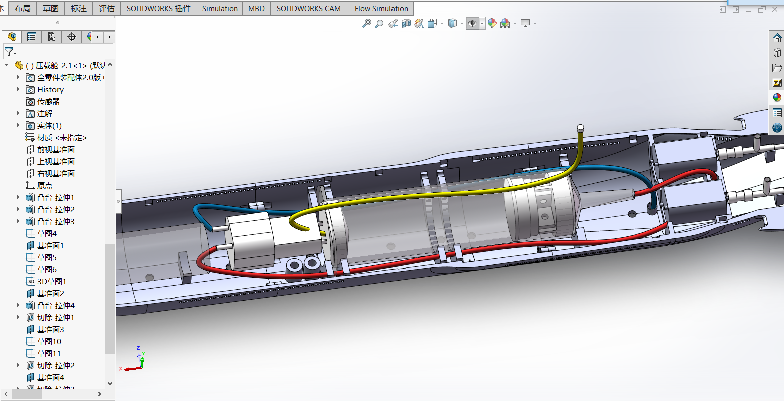 这个装配体文件跟前面所说的后缀为SLDPRT文件一样,也是使用solid works2021编辑,这个装配体文件展示的是我的第一版方案,使用行程为50mm的电推杆控制作为压载舱的针筒的活塞进排水来实现沉浮的方案,该方案配平困难,最终我没有使用该方案,有能力的网友可以试试完善这个方案